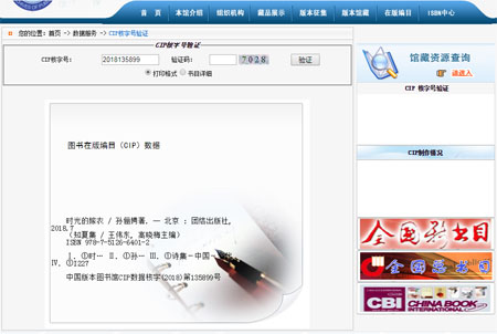 《时光的嫁衣》中国版本图书馆(国家新闻出版广电总局CIP数据)截图,查询网址: