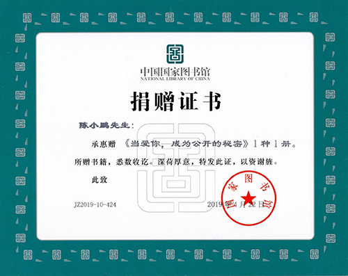 陈小鹏先生的著作《当爱你,成为公开的秘密》一书于2019年4月22日被中国国家图书馆收藏,该书是一部洗涤心灵世界、文字优美畅爽的极富高雅艺术气质的诗集。作家以心写诗,以情诉心,以爱融情,呕心沥血写出了广为读者青睐的精品。